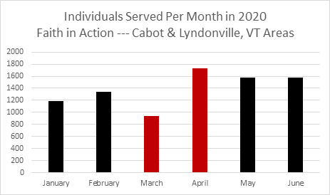 In the spring of 2020, the pandemic, and heightened concern over resource availability, substantially increased the requests for food support at Faith in Action. From March to April 2020, the Cabot and Lyndonville Faith in Action locations experienced an 83% month-over-month increase in the number of community members needing supplemental food support. The unprecedented and immediate increase in food support demand has continued into May and June, and the higher demand is expected to persist through the fall and winter.